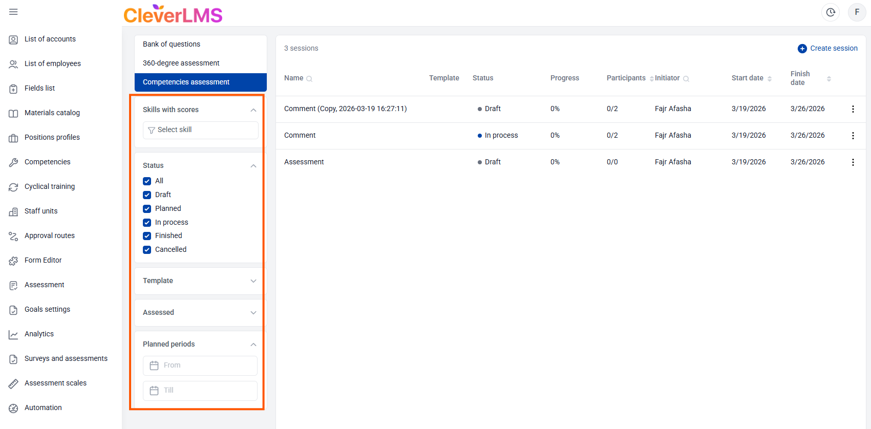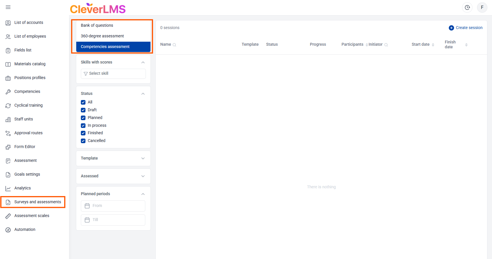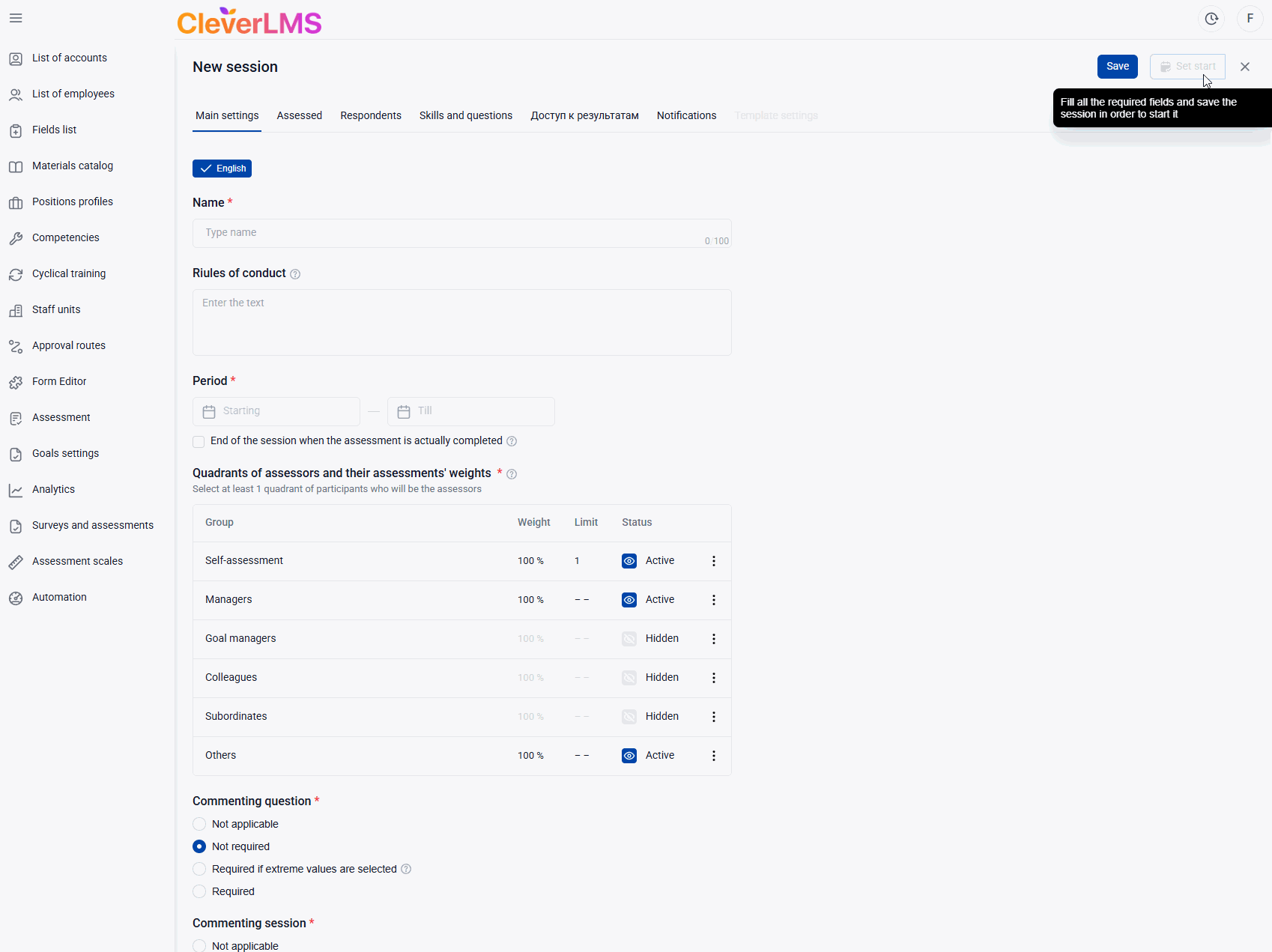 Let's look at the main parameters and stages of working with competency assessment sessions: the procedure for creating, configuring, and launching them.