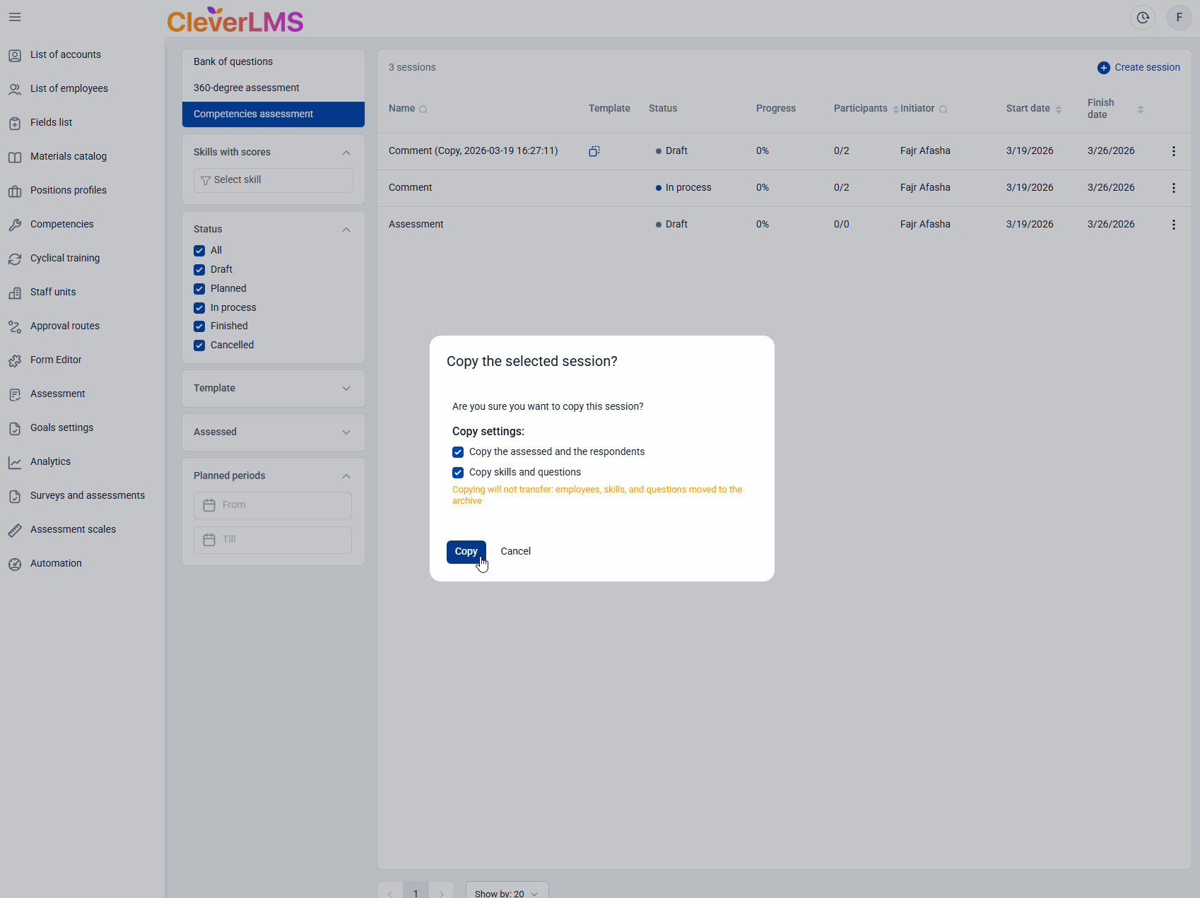 Copying allows you to create a new session based on an existing one, significantly saving the administrator time and reducing the risk of setting up similar assessment sessions. When creating a copy, the parameters and settings of the original session are transferred to it.