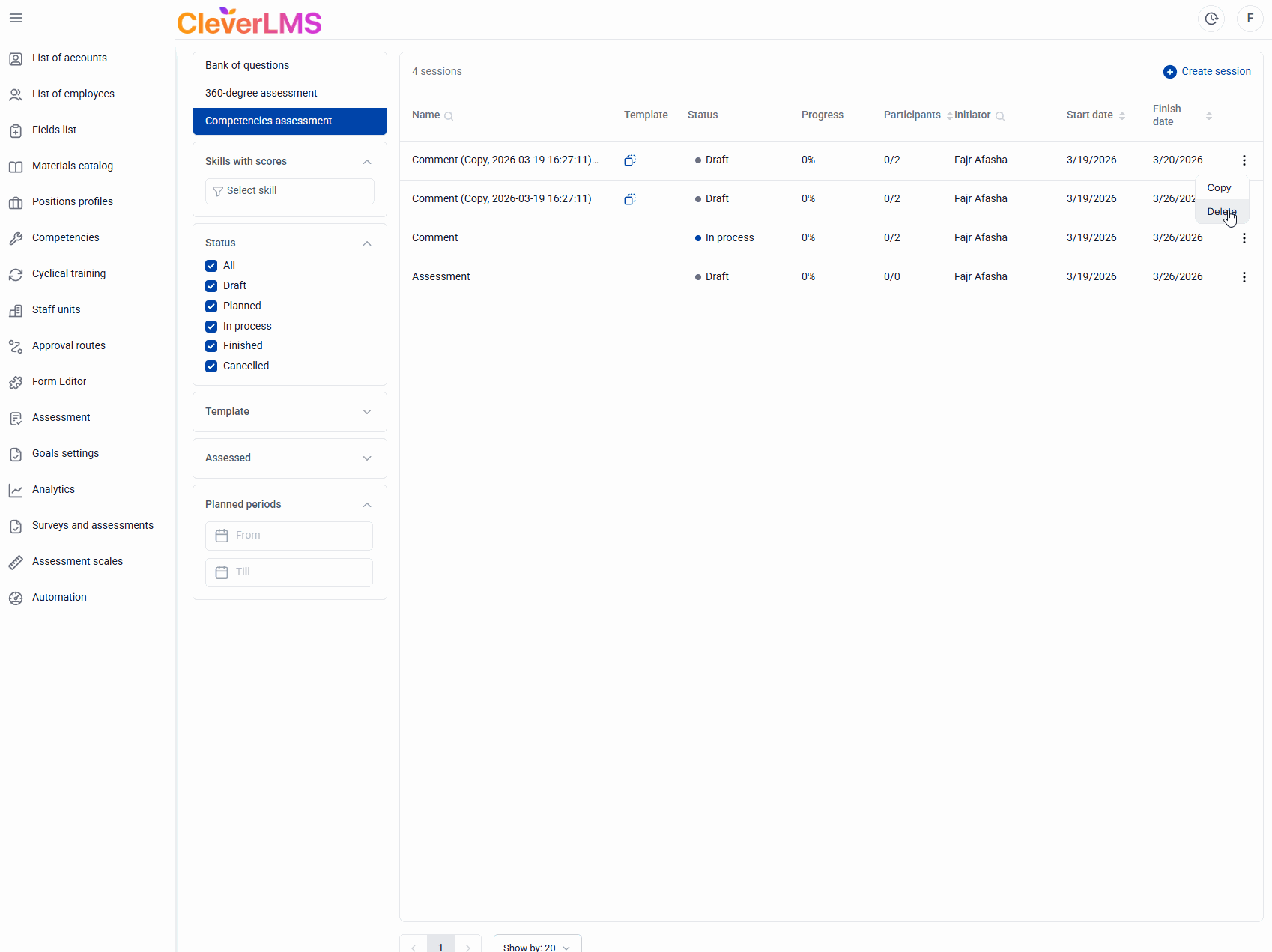 The administrator can manage the assessment session lifecycle: create copies, delete drafts, and archive sessions. These actions allow for reuse of settings, maintain order in the workspace, and gracefully stop the assessment process when necessary.